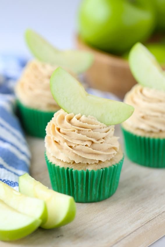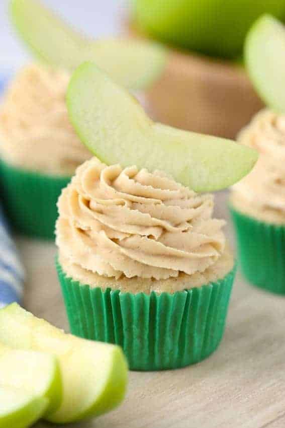 These cupcakes look picture perfect with that fluffy peanut butter frosting and green apple slices!