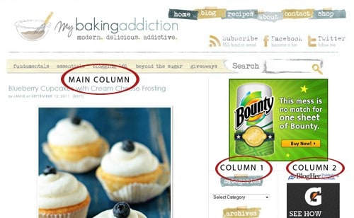 Include useful information in the header area. Links to pages such as: home, recipe index, about, frequently asked questions, contact, etc. are usually found in the header area. These subareas are typically found within a navigation bar, often referred to by design and web folks as a “nav bar”. Keep in mind that your ultimate goal should be to make navigating your site as simple and straightforward as possible. MBA has two different nav bars, one for the items mentioned above, and one below my header for the different sections that I write about.