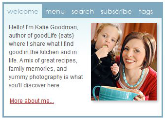 Katie also features a tabbed menu at the top of the sidebar to include information such as her weekly menu, search, subscription information, and tags. You don’t have to organize it in a tabbed menu, but that’s one way to do it – Katie simply wanted a streamlined way to consolidate some information.