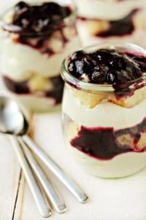 With a little help from the grocery store โ trust me, no one will know the difference. These Blueberry Trifles can be assembled in a cinch, and there is no need to bake anything. Really the most time consuming part of the whole process is preparing the homemade blueberry sauce, but you can totally do that a couple days in advance. And heck, if you donโt want to mess with it, use blueberry pie filling โ Iโm not going to judge ya!