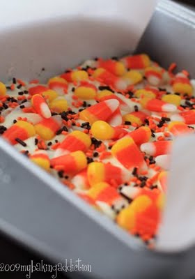 5. Top with candy corn and sprinkles. Let cool until firm. Break into pieces and store in an airtight container.