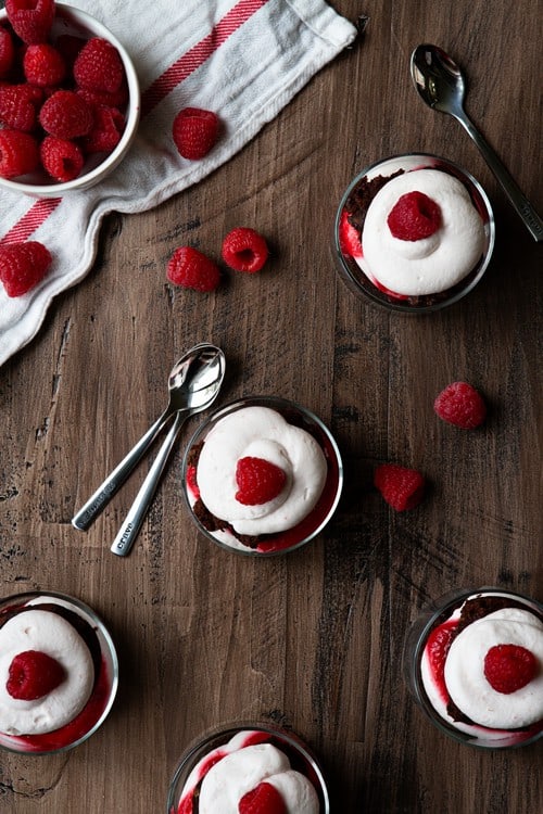 Mini Brownie Trifles are layered with raspberry sauce, raspberry whipped cream and finished with fresh raspberries to create a delicious dessert worthy of any upcoming holiday celebration.