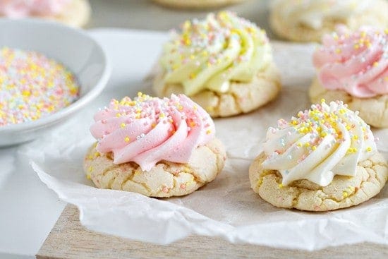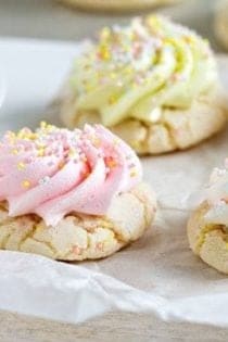 I love the buttercream on top โ after all, who can resist a sugar cookie with frosting and sprinkles? Certainly not this girl. And it makes these cake mix cookies look totally professional and like they took you all the hours in the world. Hooray for that!
