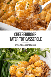 This Cheeseburger Tater Tot Casserole is a great weeknight dinner. Serve it alongside a salad with homemade ranch dressing and some honey glazed carrots or roasted green beans for a meal that both kids and adults will love.