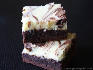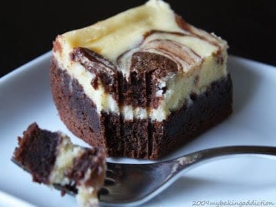 People love cheesecake, people love brownies…so why not make combine them and make one hell of a dessert? I have heard of cheesecake brownies, but I have never attempted to make them. However, last week I was feeling uninspired and decided to search for this concoction on foodgawker. There were several recipes that came up, but for some reason the one from Rosa’s Yum Yums reeled me in. I think it was the serene mint green background in her picture or maybe it was the fact that her brownies were beautifully marbled! After reading her blog entry, I realized I had all the ingredients so I got to baking! I did alter this recipe a little bit to meet my needs, but you can click here to see the original recipe that Rosa adapted from Gourmet Magazine. The original recipe yields an 8×8 batch, I doubled that recipe to fill a 9×13 pan. This recipe is seriously amazing, I guarantee people will be hounding you for the recipe, so have some on hand!