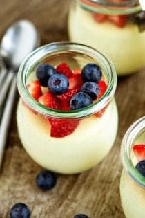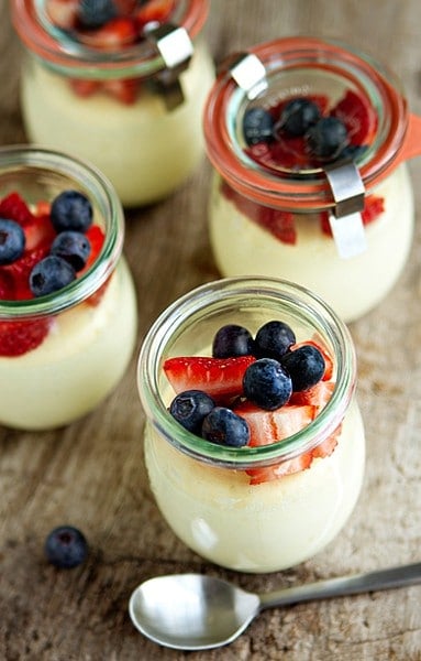 I simply scooped my cheesecake batter into small canning jars, baked them in a water bath and topped with fresh berries. The lids allow these individually portioned desserts to be placed into a cooler, so it makes them the perfect picnic dessert to wow a crowd!
