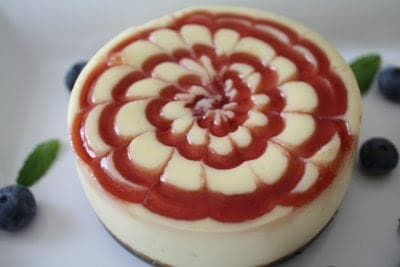 Letโs talk about cracksโฆcheesecake cracksโฆI loathe them! Yeah, yeah I know the taste is the same, but I am all about presentation and those cracksโฆnot so presentable. From what I read on the internet it seems as though the cracks develop when the cheesecake is cooled too quickly. So in case you are also a crack hater here are some tips. First, I always make sure my ingredients are at room temperature. For this recipe I wrapped the bottoms of the pans with foil and baked the cheesecakes in a water bath at 310ยฐF for 35 minutes. After 35 minutes I turned the oven off and let the cheesecakes sit in the oven with the door closed for about a half hour. Then I cracked the oven and left them in for another half hour. I then transferred them to a cooling rack until they reached room temperature, after that, they went into the refrigerator overnight. As you can seeโฆno cracks! I chose to add about 1/4 cup of berries to 2 of the cheesecakes and added a strawberry preserves swirl to the others.