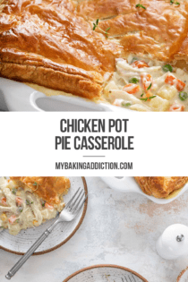 Craving chicken pot pie but don’t have time to make the whole thing from scratch? Try this weeknight-friendly Chicken Pot Pie Casserole! A creamy homemade filling topped with puff pastry is simple enough for a weeknight but comforting enough to share with company.