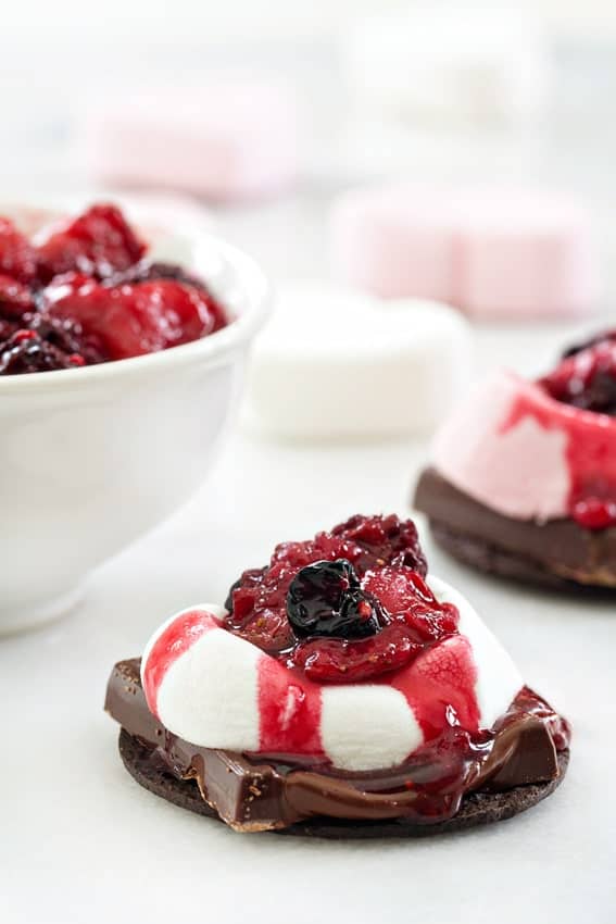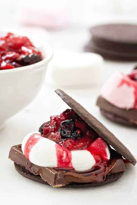 - Add a spoonful of roasted berry sauce or jam to each marshmallow and top each chocolate berry s'more with an additional chocolate wafer.