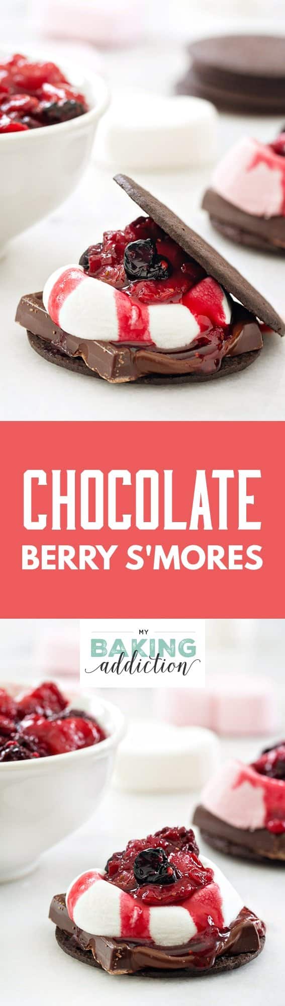 Chocolate Berry S’mores are simple to make and crazy delicious. How could you possibly go wrong with chocolate, strawberry marshmallows and roasted berry sauce? Ya just can’t.