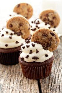 1. Garnish your cupcakes with mini semi-sweet chocolate chips and a mini chocolate chip cookie.