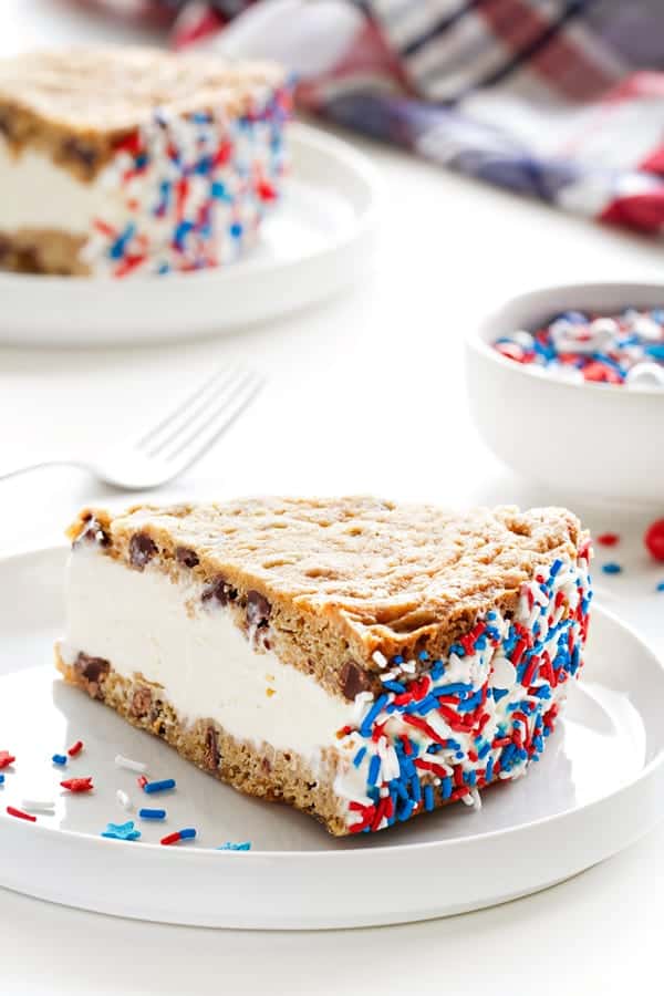 Whether you make this Chocolate Chip Cookie Ice Cream Sandwich Cake with vanilla ice cream and red, white and blue sprinkles, or strawberry ice cream and chocolate sprinkles come Valentine’s Day, you really can’t go wrong.