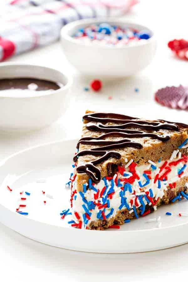 Since we’re having this on the 4th, I’m layering some festive red, white and blue sprinkles around the edge of the cake, but this will work for any holiday – heck, even Christmas! I’m a firm believer that ice cream is good, no matter the temperature outside.