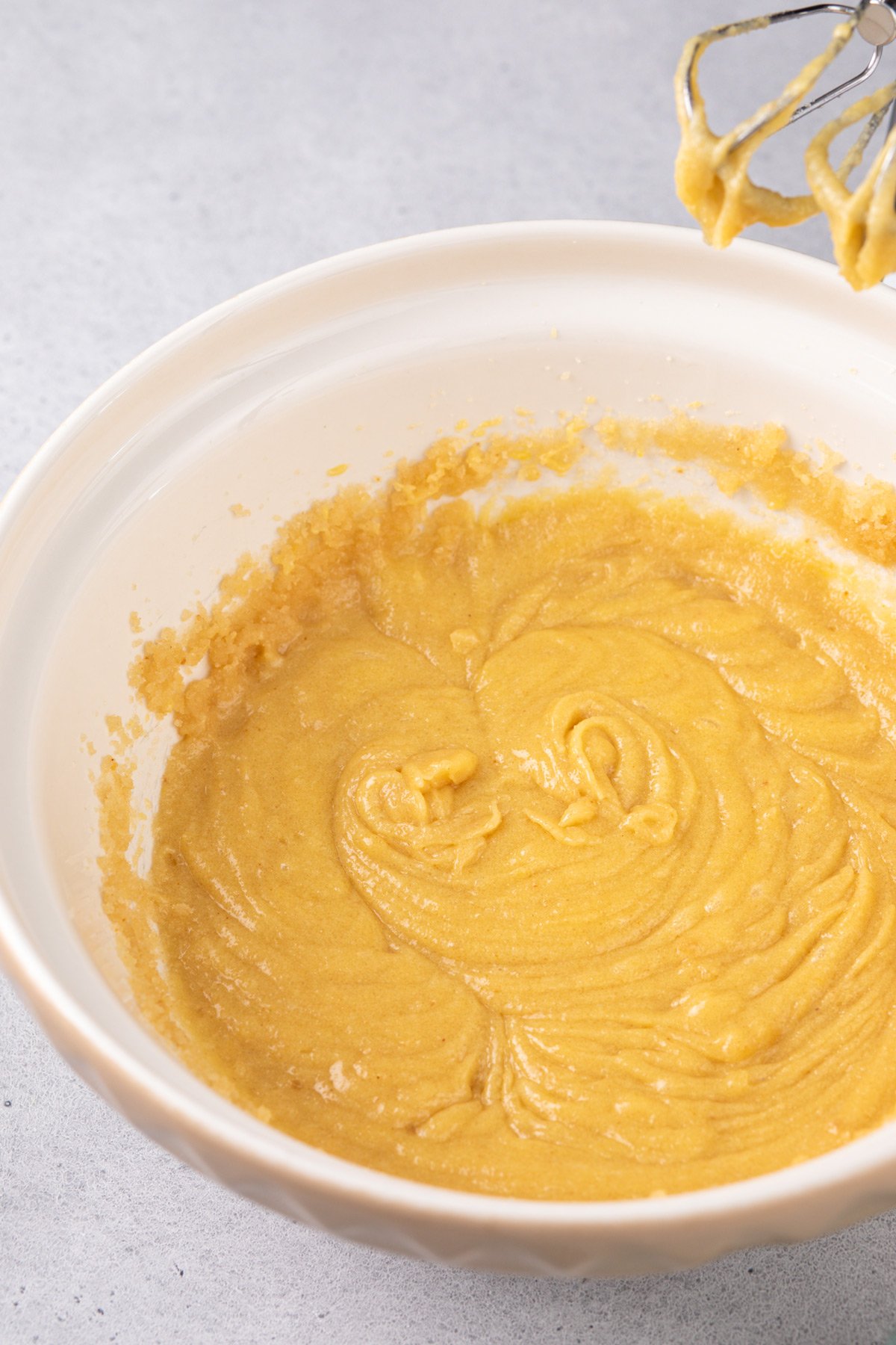 In the bowl of a stand mixer fitted with the paddle attachment, add the cooled brown butter and the sugars. Beat together on medium speed for about 3 minutes, then add the eggs and the egg yolk one at a time, followed by the vanilla.