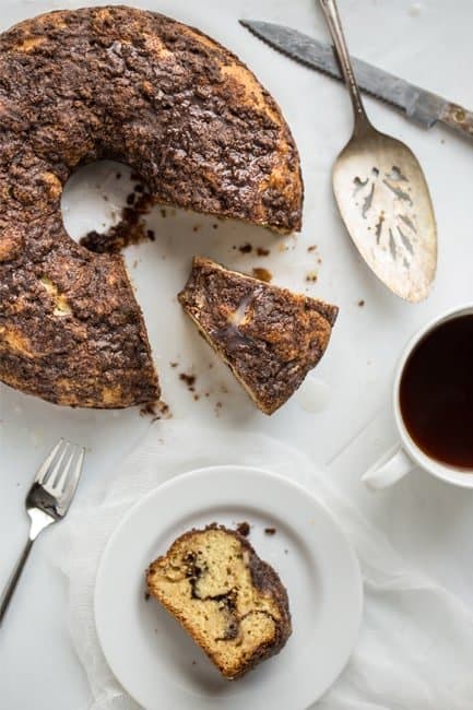 This Chocolate Swirl Coffee Cake is definitely decadent. The sour cream adds richness and moisture to the batter and the touch of espresso balances out the sweetness of the cake. Topped with a cinnamon, chocolate and espresso streusel topping and a light glaze, this coffee cake is perfect for a relaxed summer breakfast or brunch.