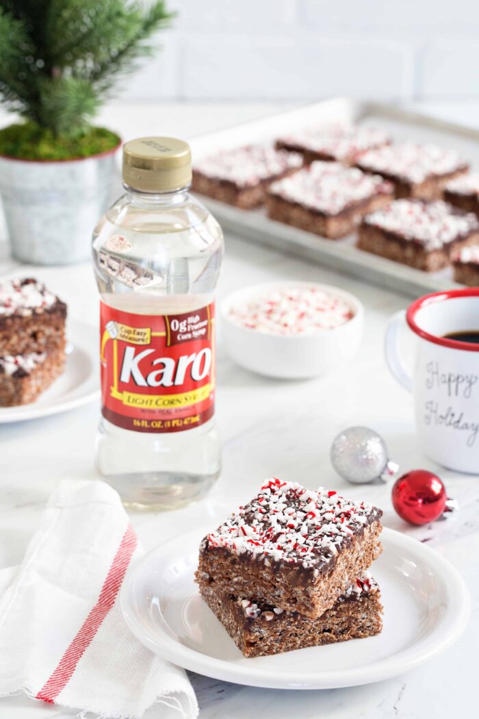 My inspiration for this recipe actually comes from Karo® Syrup’s Festive Peppermint Scotcheroos which uses traditional peanut butter and butterscotch chips.
