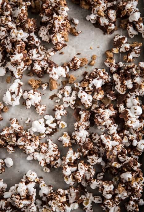 This Chocolate Toffee Popcorn can be made in less than 20 minutes (most of which is inactive time) and itโs perfect for anyone on your list. Iโm planning on bring a batch of this sweet and salty treat to my familyโs Christmas get together as a little something for my mom for hosting us all. The great thing about this chocolate toffee popcorn is that it doubles as a hostess gift and a party snack. Itโs a win win.