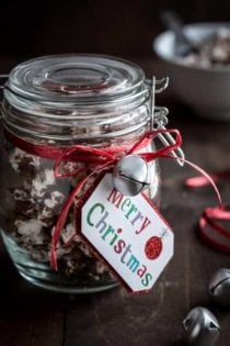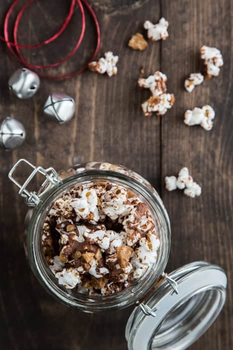 Please tell me this happens to you, too. Please? For instance, maybe youโve been invited to a last minute holiday party and you need a sweet gift to bring for the hostess. Now, you have lots of options. You could go with infused vodka, a bouquet of chocolate dipped spoons or a jar of this sweet and salty Chocolate Toffee Popcorn. I love edible gifts for times like this โ especially something laced with chocolate and toffee, like this Chocolate Toffee Popcorn. You can never go wrong with chocolate!