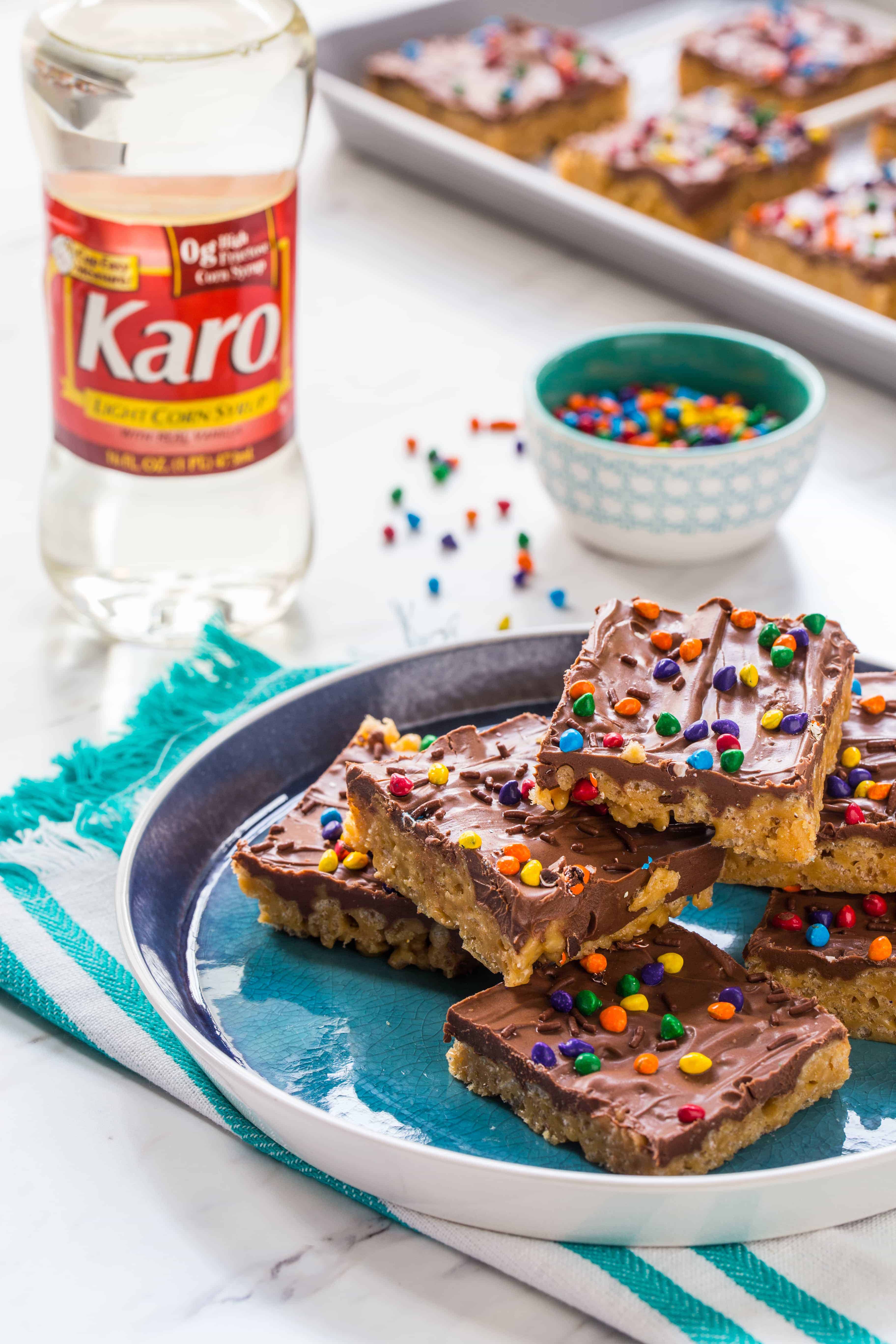 If you’ve never had Chocolate Scotcheroos, let me tell you, you’re missing out! The original recipe was created in the 1960’s and it featured rice cereal, chocolate and peanut butter. And I think no one could argue that flavor combination is an absolute classic, which is why I love Karo® Syrup’s Chocolate Scotcheroos.