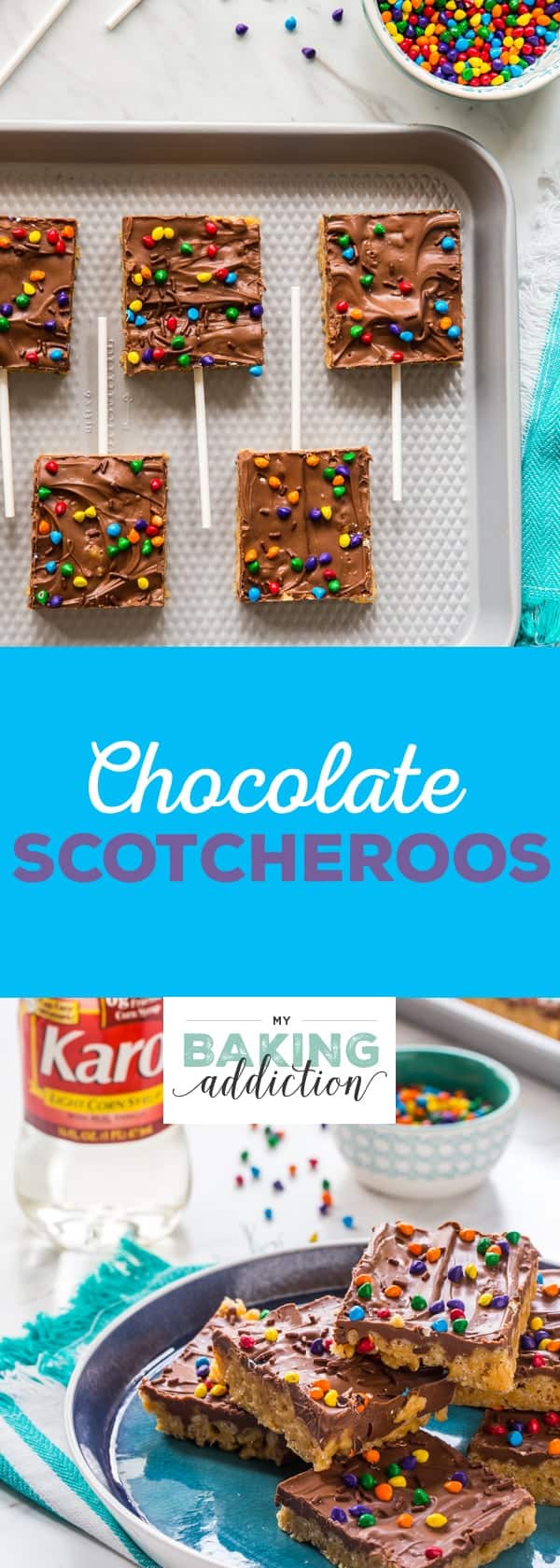 Chocolate Scotcheroos combine peanut butter, crispy cereal, and chocolate into one delicious treat. Top them with sprinkles and serve on lollipop sticks to create a fun back-to-school snack!