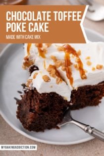 This chocolate toffee poke cake combines moist chocolate cake, caramel, condensed milk, and toffee bits for a cake that is pure decadence in every single bite!