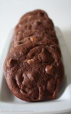 This weeks Tuesdays with Dorie recipe is Chocolate Whopper Malted Drops. I must admit, this recipe did not really intrigue me, although I do indulge in Whoppers from time to time. However, I knew my dad would drool over these, so I decided to proceed with the recipe. I could not find malted milk powder to save my life, so after checking three stores, I decided to just go ahead and use Ovaltine. I have never purchased Ovaltine and the only mental reference I have for Ovaltine is from the movie, A Christmas Story. If you have seen this holiday classic, you know that Ralphie decoded Little Orphan Annie’s secret message only to be disappointed that it was an advertisement for Ovaltine. Anyhoo…the dough came together easily and resembled thick frosting, but cutting those Whoppers was a pain in my ass! I tend to be overly anal and had to cut all of them in fourths as opposed to let’s say…beating them with a rolling pin or tossing them in the food processor. Honestly, I did not like this cookie dough at all and I kinda consider myself a cookie dough connoisseur. I weighed each cookie out to 1.3 ounces (more analness) and ended up getting 28 cookies. The cookies were very puffy when they came out of the oven, but deflated after they cooled to what is pictured. Speaking of pictures…I did not find these suckers to be very photogenic, or maybe I was just having a crappy camera day! Interesting Whopper fact…apparently these suckers turn in to a toffee like substance when they are baked which kinda bewildered me, but they did impart a nice texture to the baked cookie! The people that consumed these cookies thought they were tasty…I sent my dad some in the mail and his opinion will be the true indicator! If you want to see more Chocolate Whopper Malted Drops, check out the Tuesdays with Dorie site. If you want the recipe, check out Rachel’s blog, Confessions of a Tangerine Tart. Enjoy!