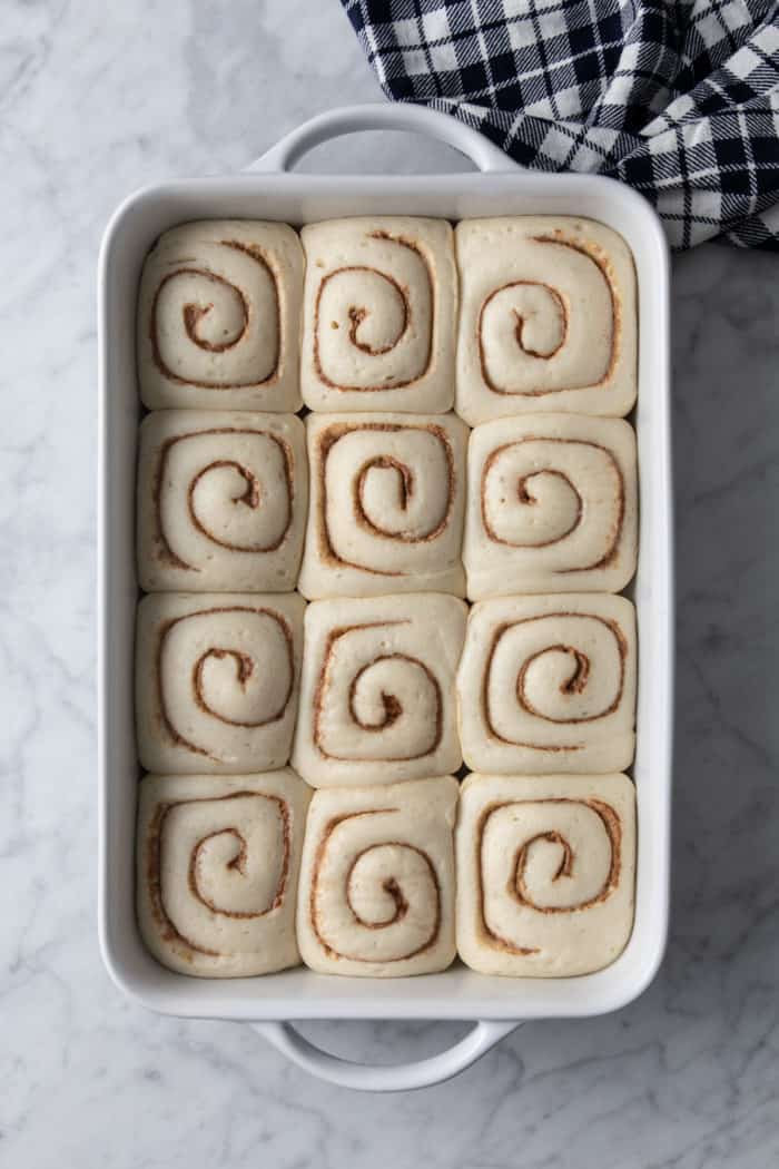 Place all 12 of the frozen cinnamon rolls in a greased 13×9-inch baking pan and cover the pan with plastic wrap.