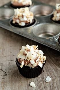 5. Frost your cooled cupcakes and garnish with toasted shaved coconut.