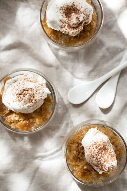 Simply take your favorite coffee – the stronger the better – sweeten it with some brown sugar and boost the flavor with a bit of citrus zest, dash of Kahlua and pinch of cinnamon. All of this java goodness gets placed into the freezer and fluffed with a fork every half hour or so as the ice starts to form. That is all it takes. I told you, simple.