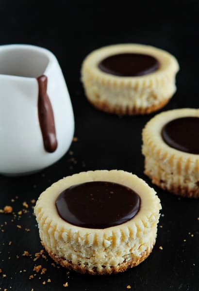 I embraced the small divot created on top of the mini cheesecakes by the weight of the cookie dough pulling it down during baking, by of course, adding more chocolate. That pool of chocolate ganache hides the cookie dough surprise and makes for a silky and alluring visual punch.