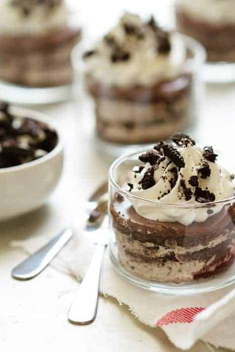 Not only is this recipe incredibly easy, it also doesn’t require the use of an oven which makes it perfect for the upcoming summer months. You can also experiment with different serving styles. For this particular recipe, I decided to dress up this simple dessert by using a round biscuit cutter to create circular cake shapes which I placed in small glass bowls. A simple swirl of whipped topping and crushed Oreos makes this super simple dessert a little fancy schmancy!