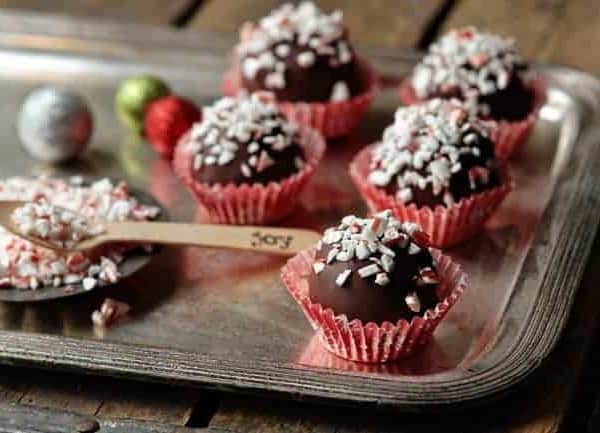 Cookie tin filled with Peppermint oreo balls on a gray counter