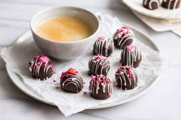 White plate with 3 turtle cookie balls in front of a cup of coffee