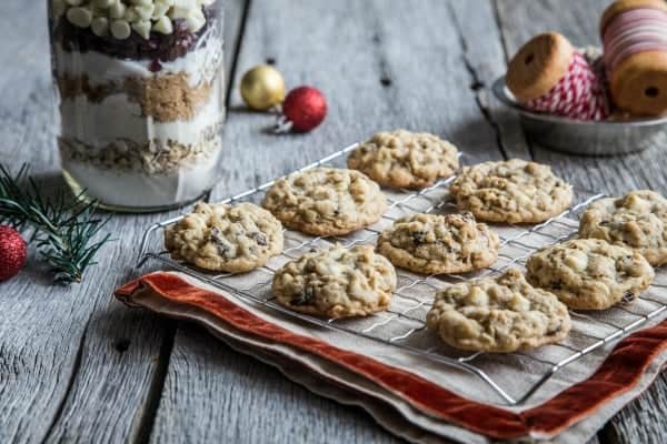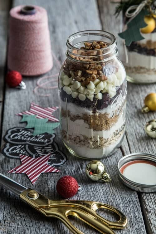Cranberry white chocolate cookies in a jar are a homemade gift sure to please. Add custom tags for a whimsical feel.