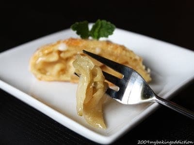 We are not huge fans of warm fruit desserts in my home, but being a Daring Baker I had to at least give it a whirl. If we liked it, great…if not, no big deal. I decided to stay with the apple recipe, but changed up the ingredients quite a bit from the original Daring Bakers recipe. I also omitted the nuts and raisins, because we do not particularly enjoy those in desserts either. I would’ve tried a mini cherry version, but to my dismay my beautiful cherries had grown a slight fuzz! I decided to make three small strudels just because I have a slight obsession with minifying baked goods!