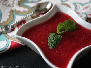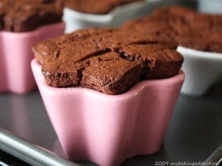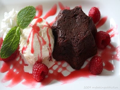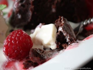 I served my mini cakes with the ice cream, whipped cream and a delicious raspberry sauce from allrecipes. All of the flavors complimented each other wonderfully and we were truly impressed with the simplicity of this recipe and the fact that is produced such a magnificent dessert. Many thanks to Dharm and Wendy for picking this fabulous dessert…you can find the recipe by clicking the links to their blogs. If my post leaves you craving more flourless chocolate cake, head over to the Daring Bakers Blogroll for my versions of this sinfully delicious dessert.