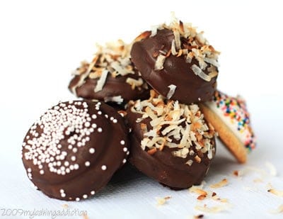 When the chocolate was still wet I sprinkled on some toasted coconut and threw some non pareils on a few after I ran out of chocolate. I’m looking forward to trying out the Milan Cookies later this week! For more variations of this this Daring Bakers’ Challenge, check out the Daring Kitchen.