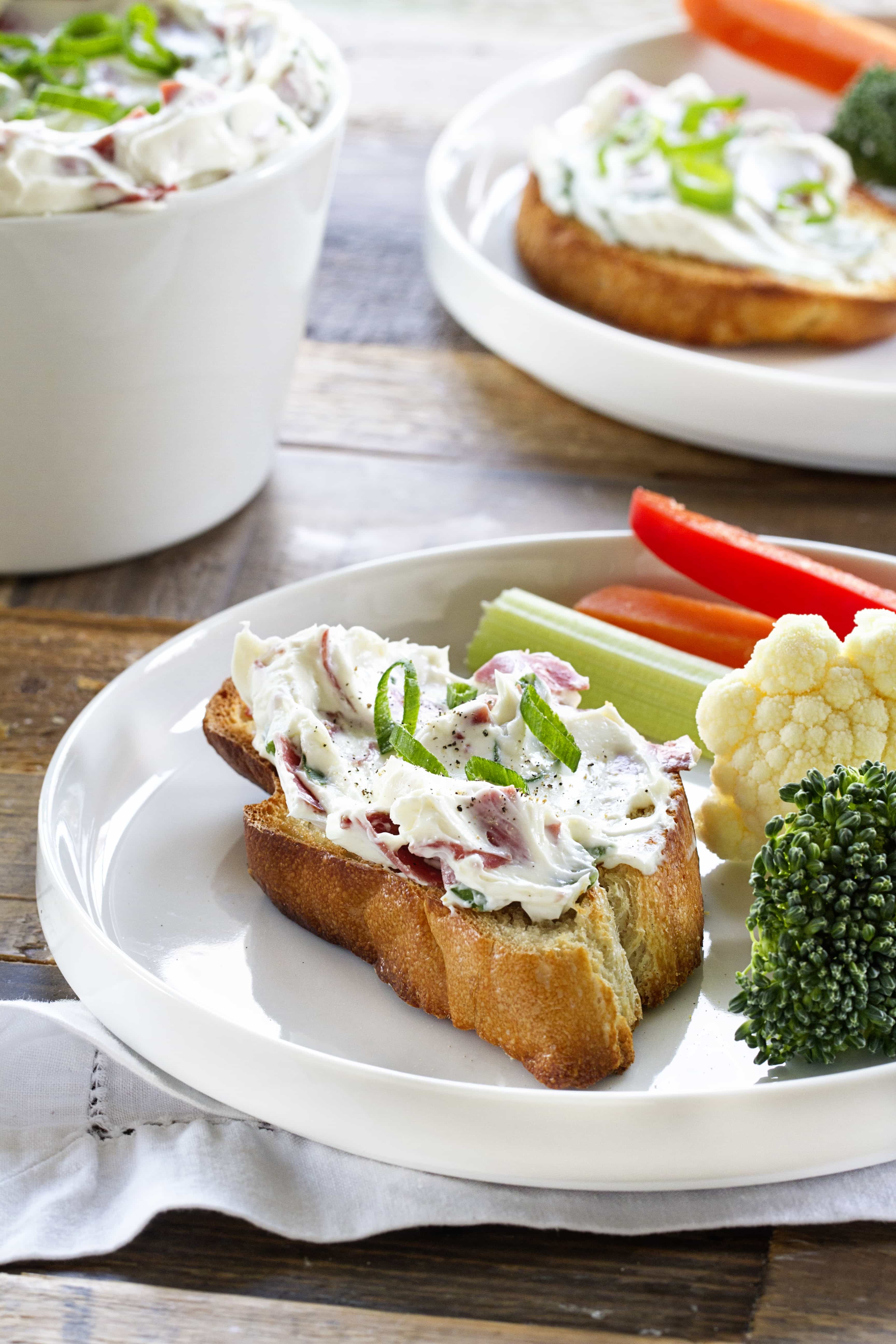 - In a medium bowl with an electric mixer, beat cream cheese until smooth. Mix in dried beef and green onions until fully incorporated.