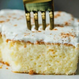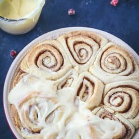 I like to top this eggnog cake with some whipped cream and some sparkling sugar, but you could also top it with more cinnamon or nutmeg if you like!