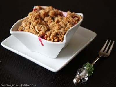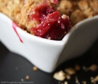 - Cover cherries with crisp topping, dividing it evenly between the four ramekins.