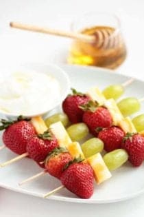 I thought I’d help out by putting together some simple and delicious recipes that will be perfect for your Mother’s Day brunch or barbecue. First on the menu is Fruit and Cheese Kabobs with a Yogurt & Honey dip. With just five ingredients and minimal prep time, they’re a great portable and colorful party appetizer.