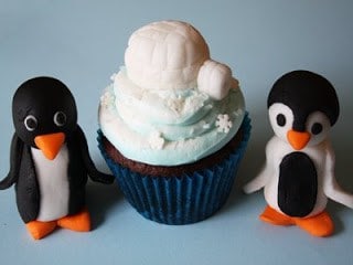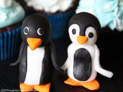 As most of you know, I take a lot of baked goods to my place of employment. One of my co-workers approached me on Monday to make a cake for her sonโs first birthday. She wanted the cake to be themed around the cartoon character Pingu. I had never heard of Pingu, but a quick google search led me to the cutest little Penguin! I could not make the cake because I was having oral surgery on Wednesday and knew I would be out of it due to pain meds. However, I agreed to make some chocolate cupcakes for a small party she was having on Wednesday. I had very little time to prepare, but decided I would try my hand at fondant. If you have never worked with fondant before, it is very similar to clayโฆI was sort of shocked how easy it was to work with. I left the little penguins off the cupcakes because I was afraid they would take a dive in the box and destroy the cupcakes. I also cut some letter A shapes and placed them on a few cupcakes for because that is his first initial. Although these recipes have been featured on my blog before, I had to share the little fondant creations. I did not think they turned out half bad for a fondant newbie.