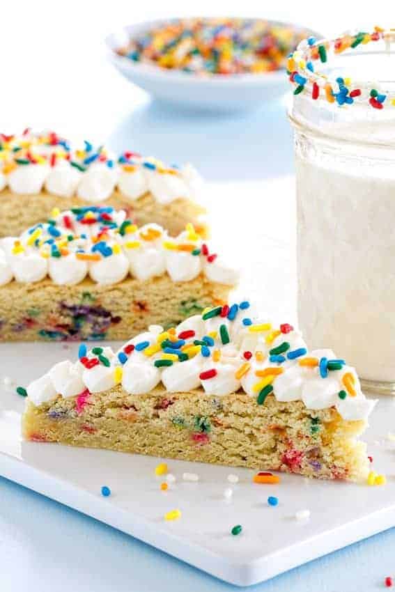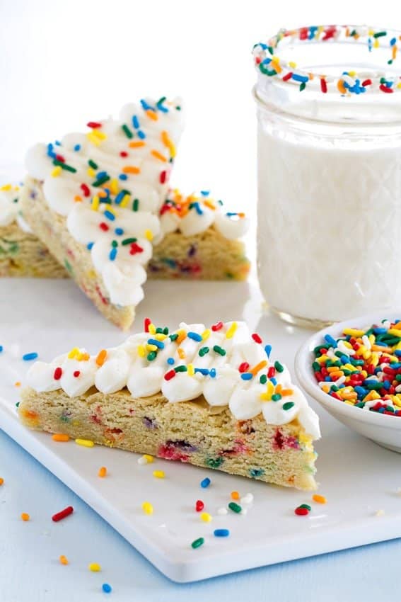 You can jazz Funfetti Sugar Cookie Bars up by cutting them into shapes like triangles, circles and sticks, or traditional squares.