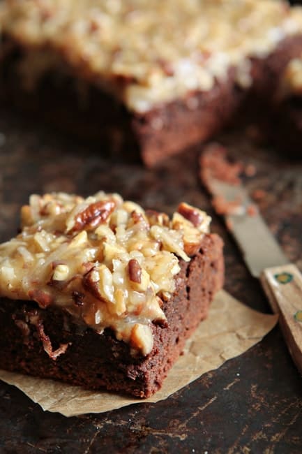 Some days I have a lot to say; however, today is not one of those days. So instead of telling you about the fact that right now my neighbor is wielding a broom while running around his backyard shooing away geese or about the fact that my dog has been incessantly licking my toes for the past 2 hours, I’ll simply talk to you about German Chocolate Brownies.
