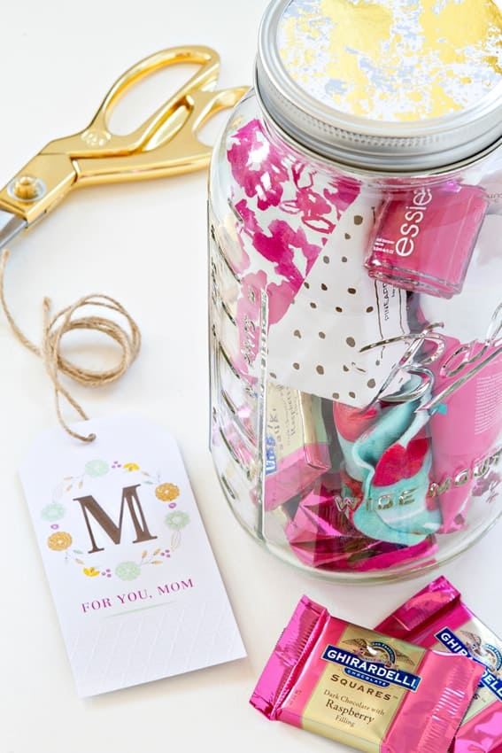 Filled with Ghirardelli SQUARES, lotions and potions from Sephora (sample sizes), a candle that smells divine, a bath bar, and nail polish, these pretty mason jars are so easy to make. They don’t take long at all, but they really put forward the idea to any mother in your life that she should take some time for herself.