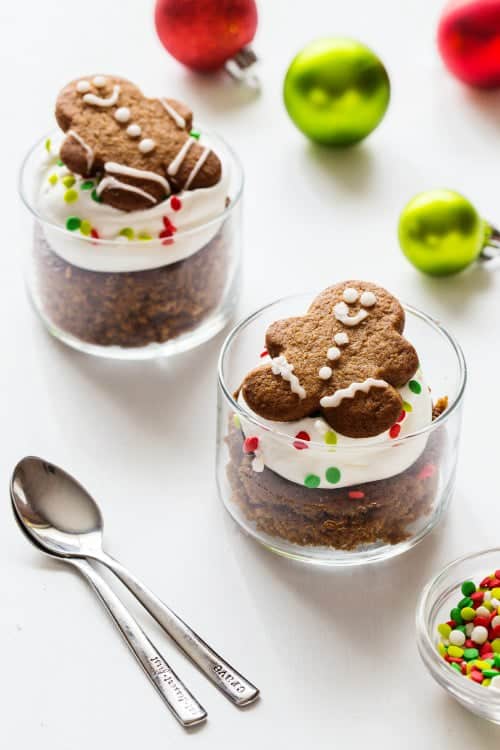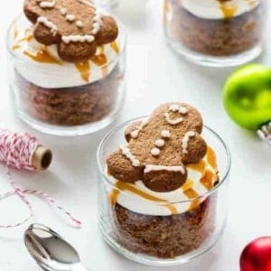 Add a dollop of freshly whipped cream, that ribbon of salted caramel I talked about earlier, and don’t forget the adorable little gingerbread man! He is absolutely necessary to make this picture perfect dessert complete.