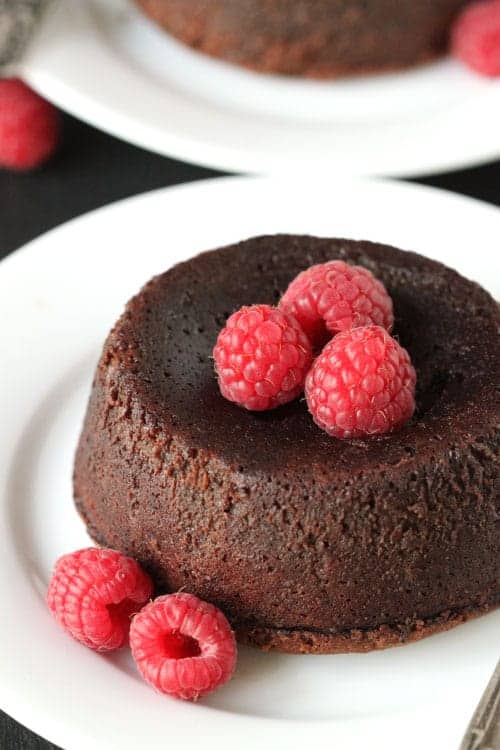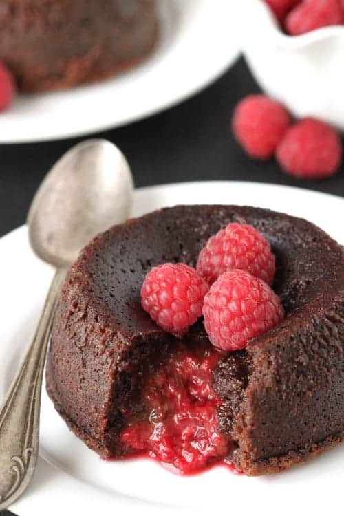 These super decadent gluten-free lava cakes have a raspberry center and make just enough for two!