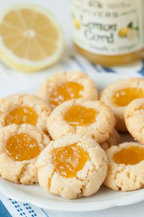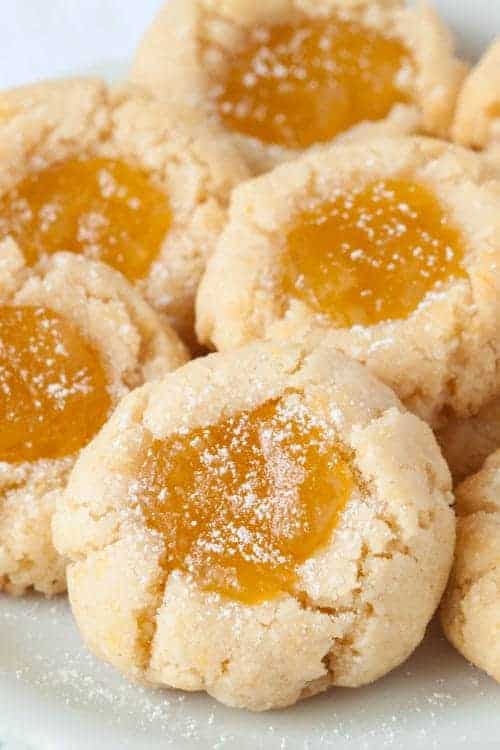 In some of the cookies, I used this homemade lemon curd and in a few I used store bought lemon curd that was more translucent and jam-like looking. Both were delicious so feel free to use either one! Jam would also work well here, but make sure to use jam and not jelly, which isn’t nearly as thick. I’m thinking that raspberry jam would be amazing!