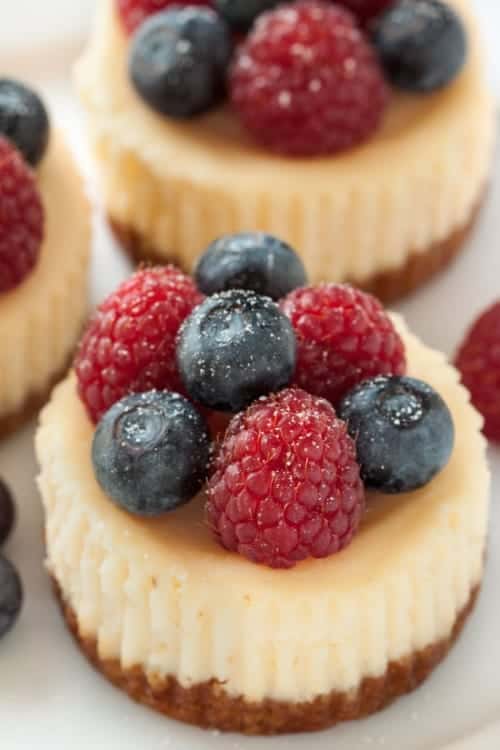 You can decorate the mini cheesecakes simply with blueberries and raspberries like I did or use a dessert sauce, like my honey sweetened strawberry sauce. And if it’s already too hot to bake and you need some cheesecake now, try Jamie’s no-bake lemon Oreo cheesecakes (but make sure to use gluten-free ingredients, if necessary!)