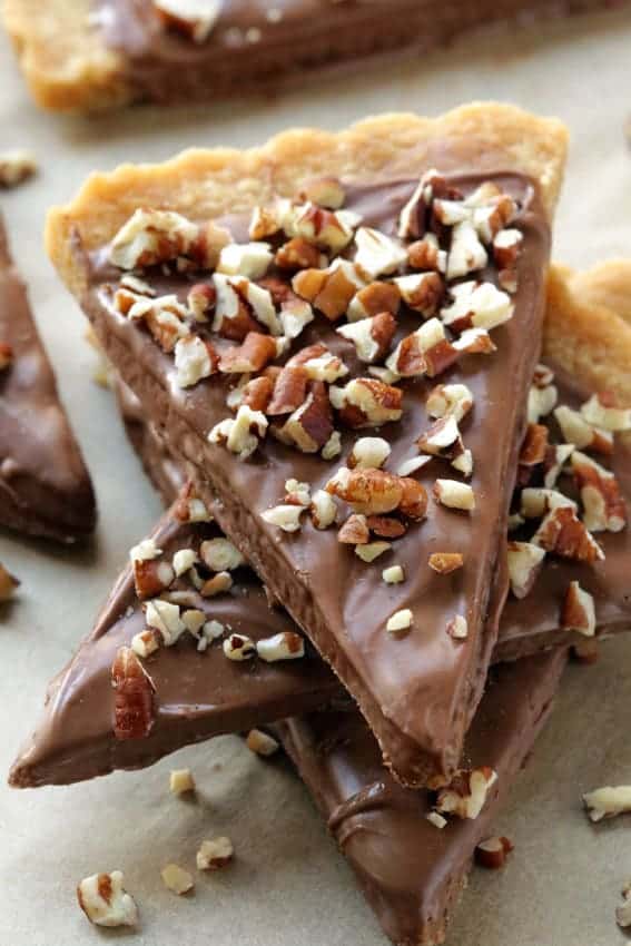 - Spoon the chocolate over the top and sides of a piece of shortbread and use the spoon to even it out. Place the shortbread on the parchment paper and sprinkle with nuts. Repeat with the remaining pieces.
